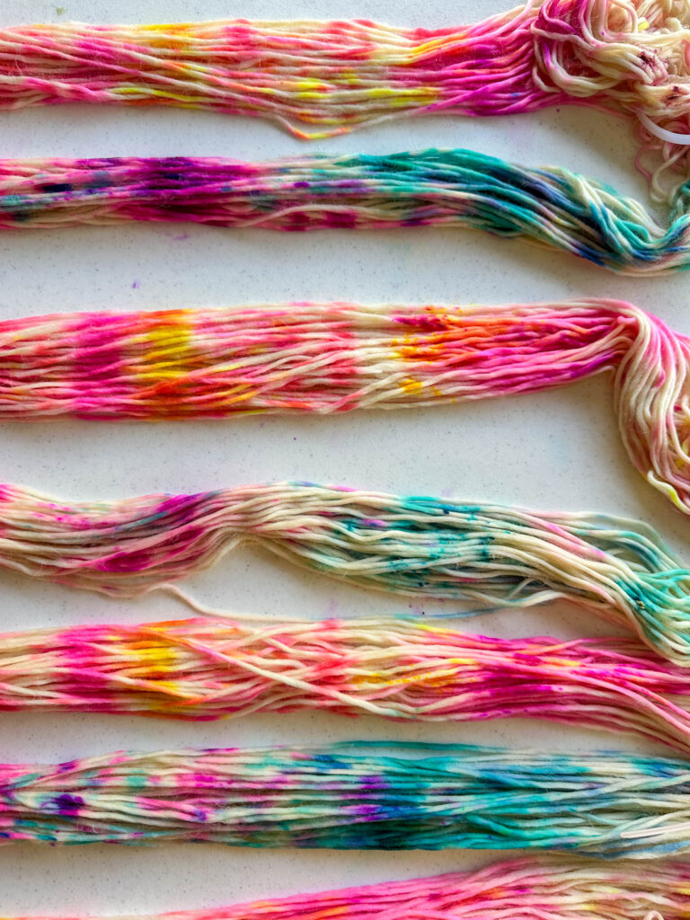 Each Prism shawl begins as bare, luxurious yarn made from superwash Merino wool and baby alpaca — soft enough to melt into your hands. I mix all the dyes myself, hand-painting each skein with brushes and intuition.
